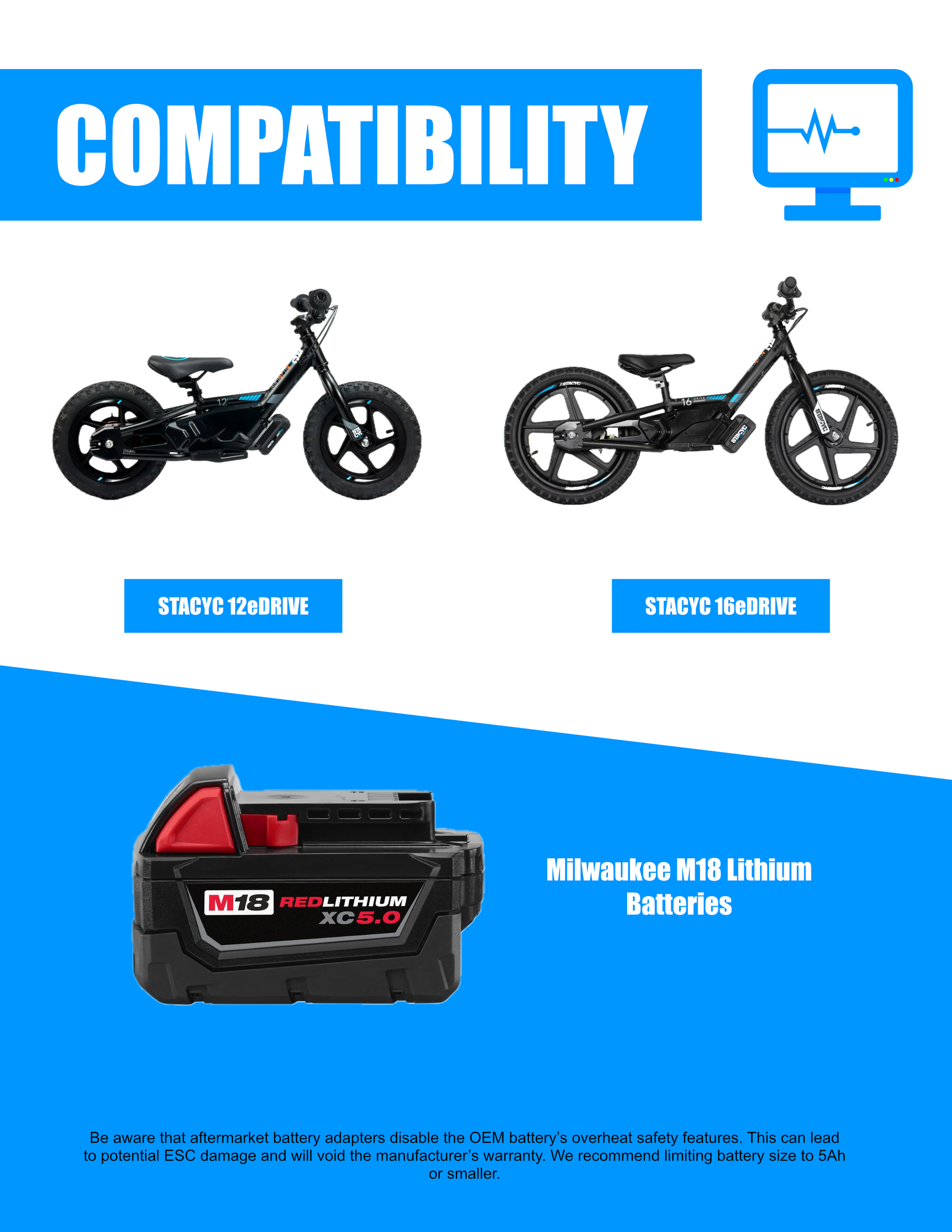 Introducing the Stacyc to Milwaukee Battery Adapter - Revolutionize Your Ride! Experience the ultimate in versatility and convenience with our cutting-edge Milwaukee battery adapter designed to seamlessly integrate with your Stacyc bike. Whether you are using the 12" or 16" model, our adapter is here to elevate your biking experience. Say goodbye to short ride times and proprietary batteries, our adapter is a game-changer.